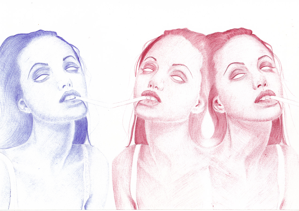 Boli Bic azul y rojo sobre papel reciclado.